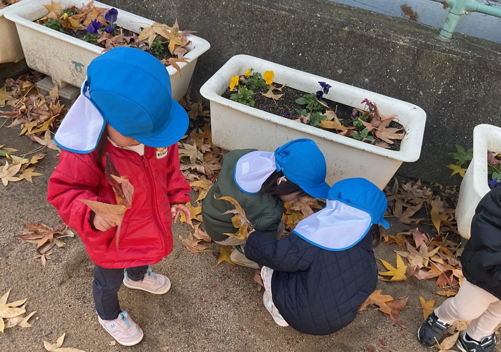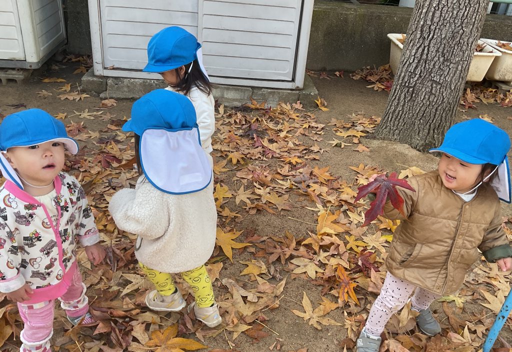 自分のお気に入りの葉っぱを見つけて保育教諭や友達と見せ合うことも楽しんでいて自然物に親しみ