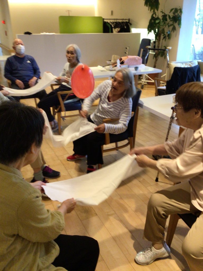 別の日にはタオルを使って風船運びで頑張っておられます💪 お隣の方に上手に運んでおられます💪