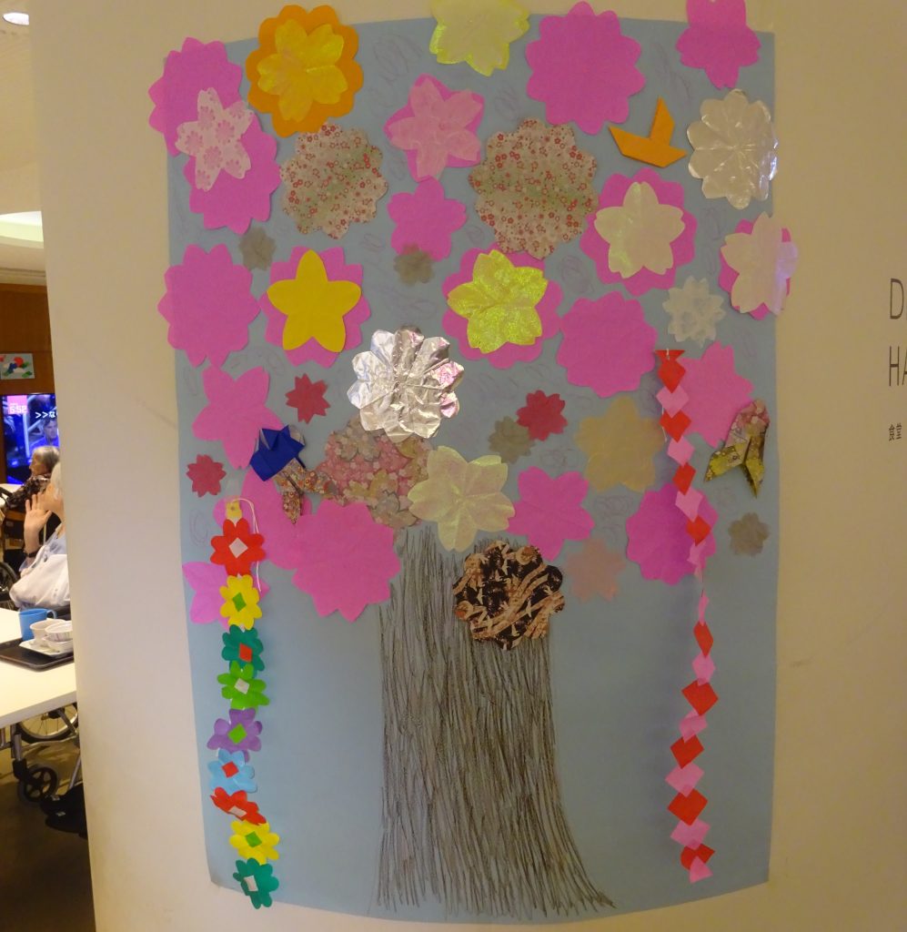 皆で大きな模造紙に桜の木を作りました。