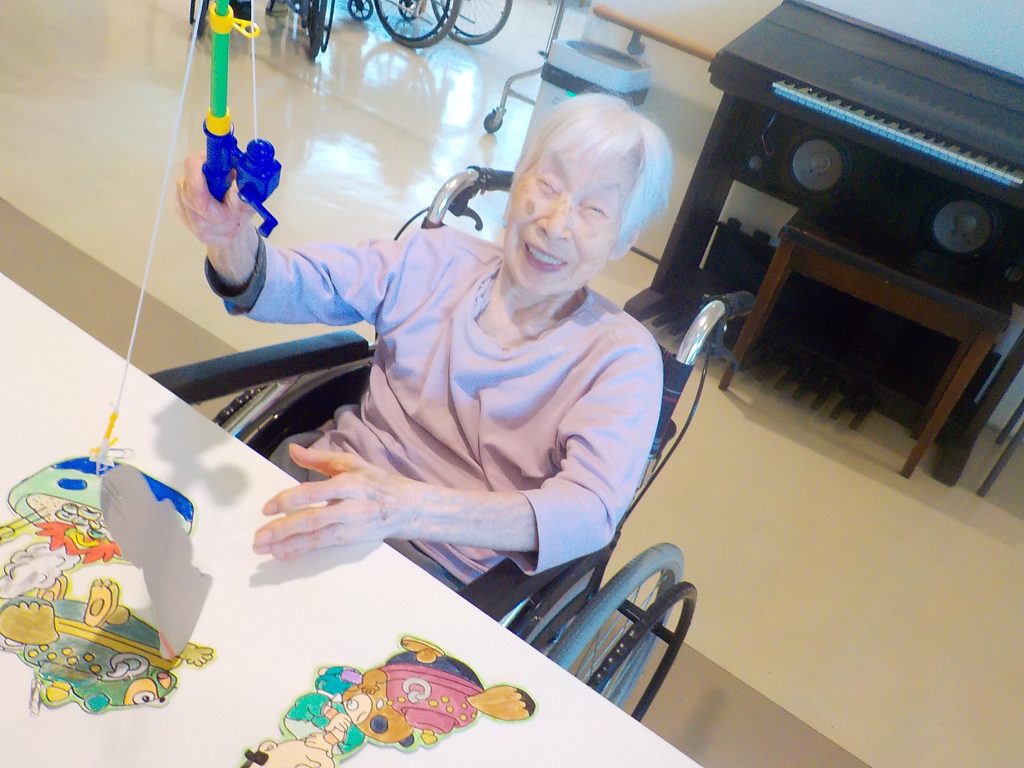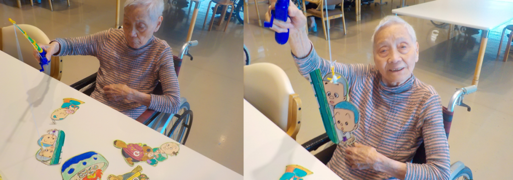 魚釣りレクはいつも盛り上がり、水を連想するため少しでも涼んでもらえるかと