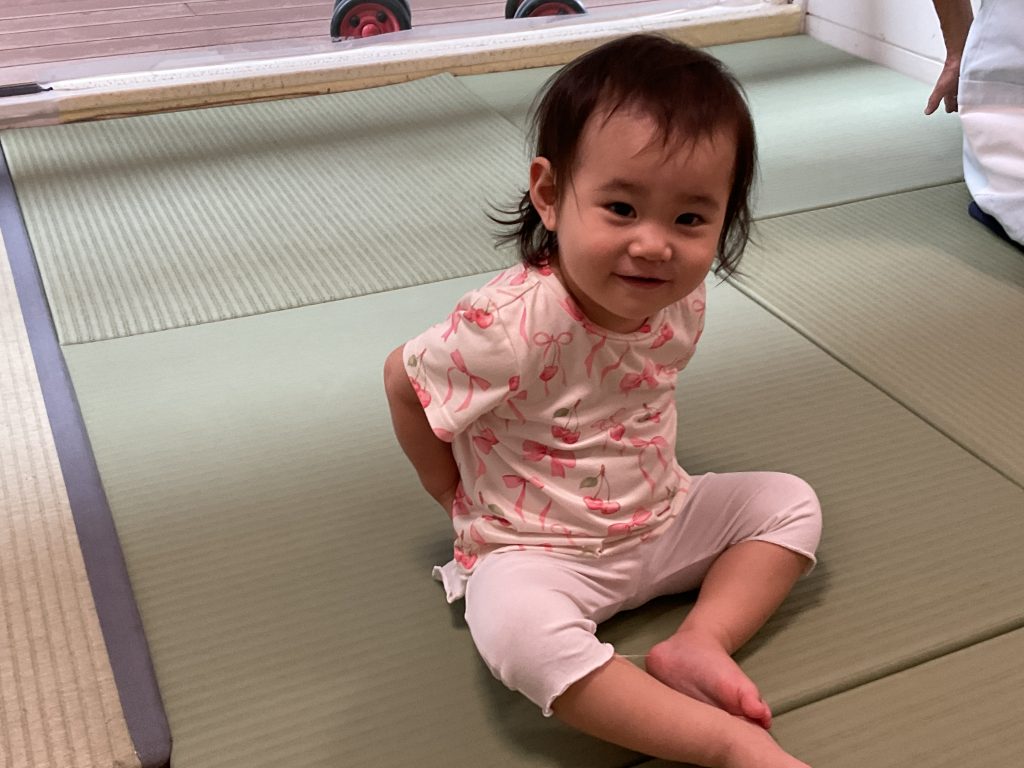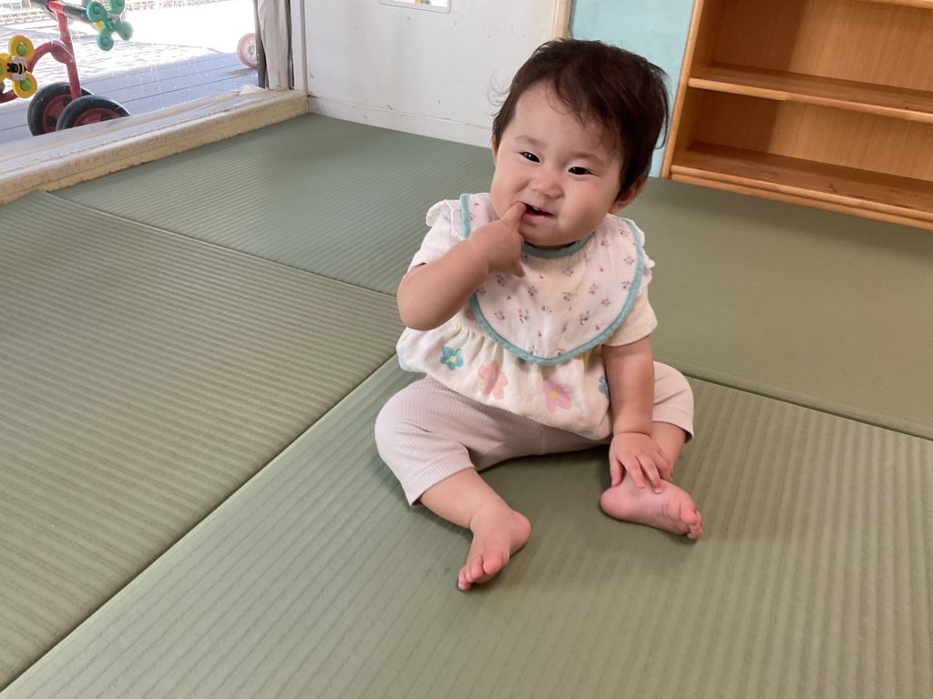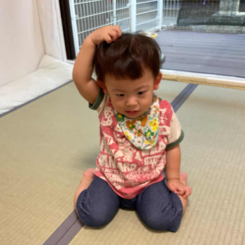 絵本のだるまさんと同じポーズを取りながら読み聞かせをすると笑顔で喜んでいた9月のある日、「だるまさんのけ」と読みながら保育士も頭を触ると、真似をして自分の髪の「毛」を触って表現していました。