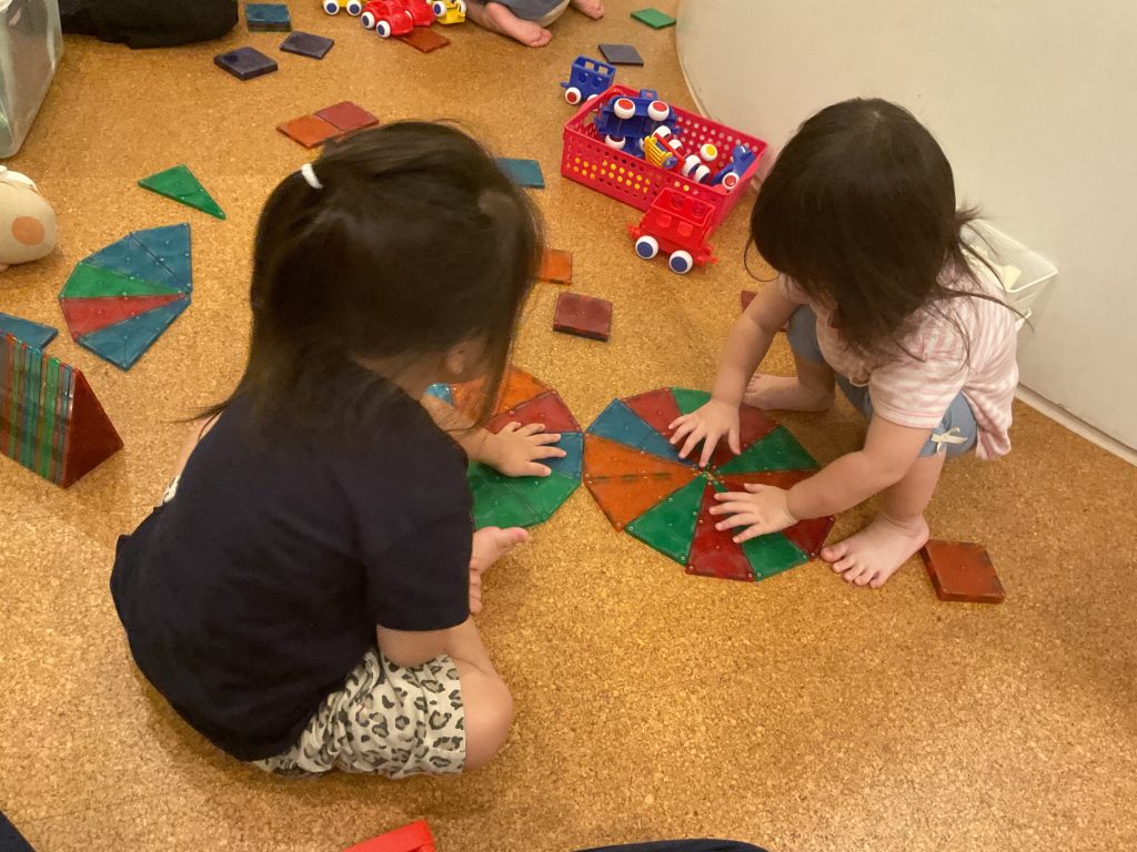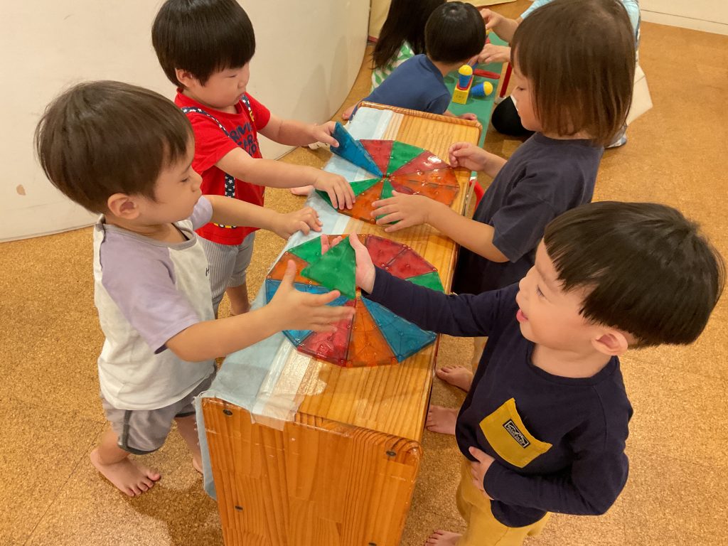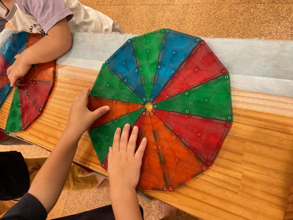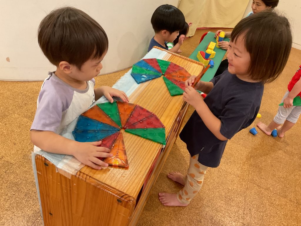ピタゴラスやマグビルダーの玩具を繋げたり組み立てたりして遊ぶことに夢中な子どもたち。最近は三角のピタゴラスを繋げてピザやアイスクリームをつくることがブームです。