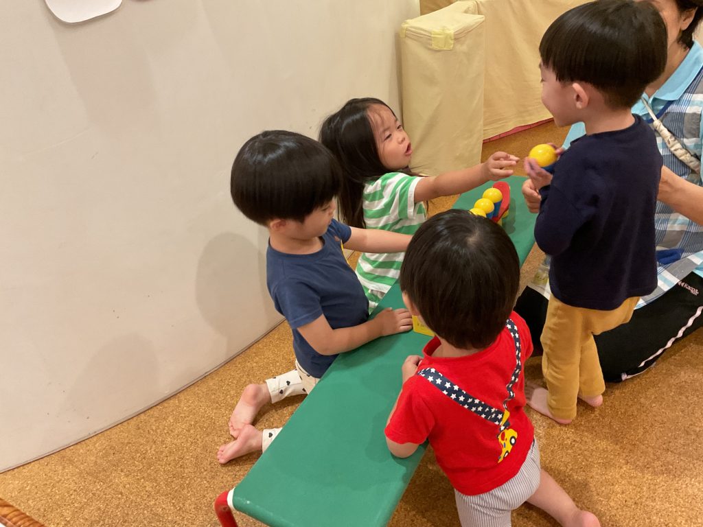 始めは数人だったお店屋さんごっこ遊びが、1人増え、また1人増え、気付くと小さなお店屋さんが大賑わいになっていました。言葉でのやり取りも上手になり、子ども同士で言葉のやり取りをしながら遊ぶ姿も見られました。今後も色々なごっこ遊びを取り入れ、子ども同士でやり取りをする姿を見守っていきたいと思います。
