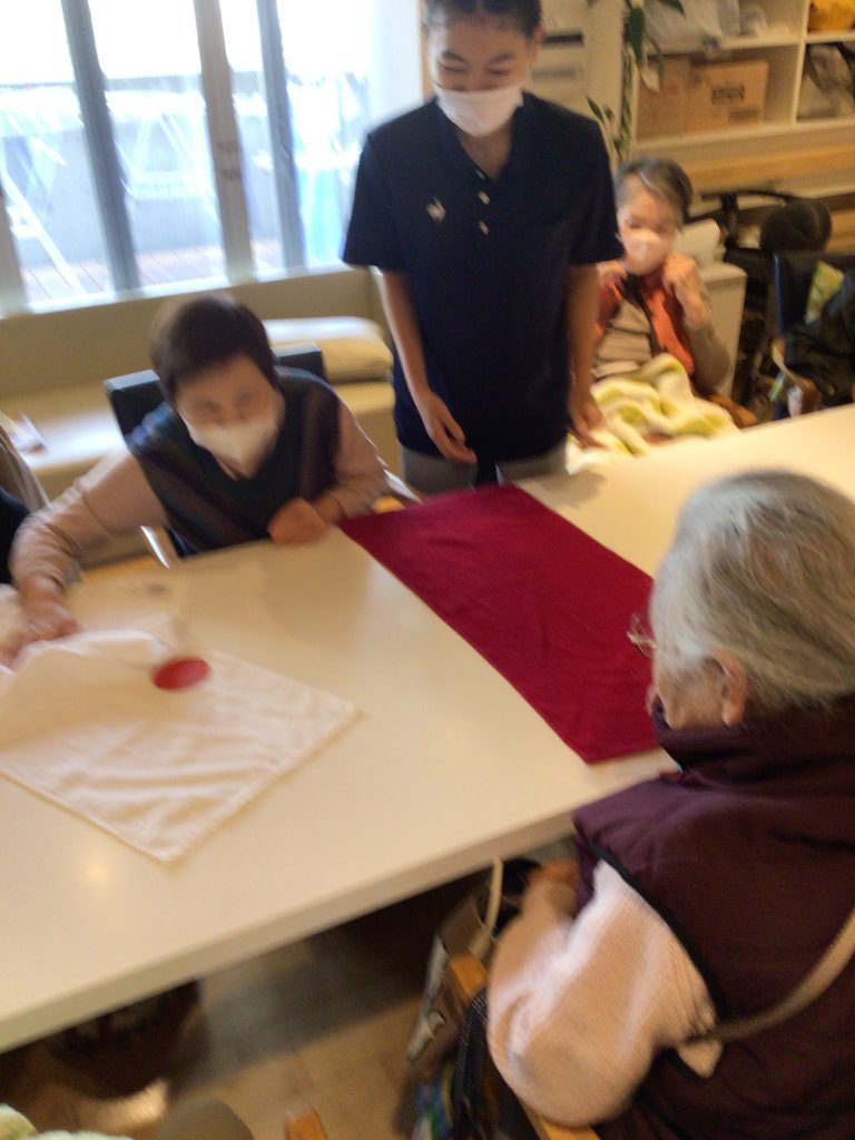 この日のゲームは丸い赤白の札を投げて、出た色のタオルを先に取るゲームです。 慌てると間違った色のタオルを取ったり、笑いが止まらないゲームでした(>_<)