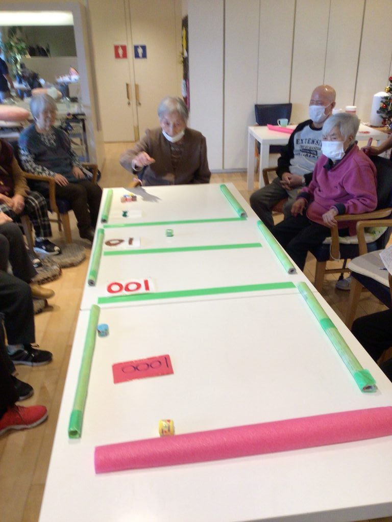 この日はペットボトルのキャップを合わせた物を転がして、得点を競うゲームです。