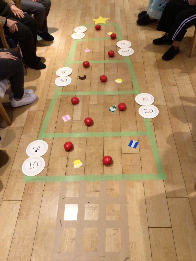 また違う日には、床にクリスマスツリーを書いて、そのマスの中にボールを転がして、点数を競うゲームです🎄