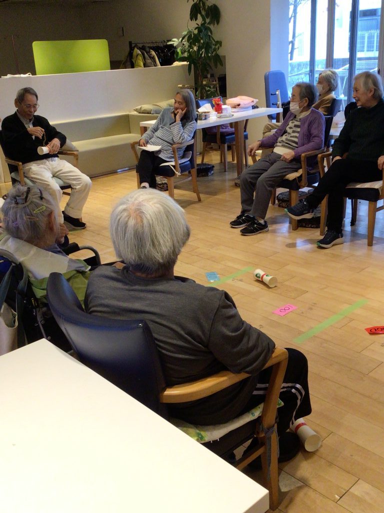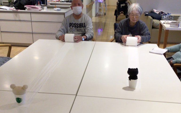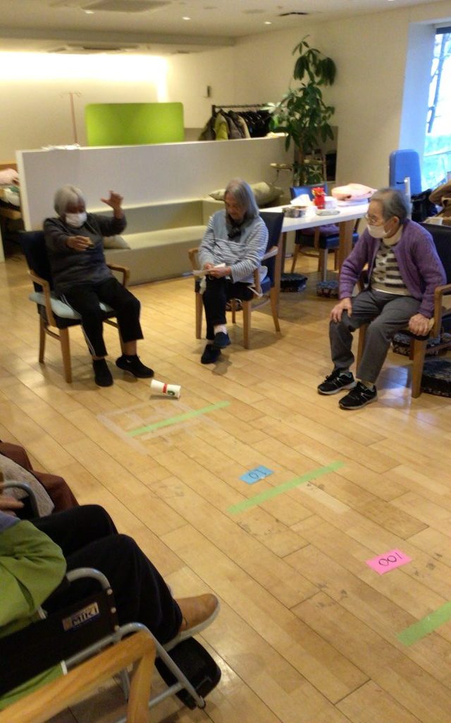 24日には紙コップを2つ繋げてそこに輪ゴムを巻いて、飛ばして落ちたところの点数で競うゲームですが… 皆さまなかなか思うようにはコップが飛ばず、それでも出来たら皆さま拍手👏で「凄い!出来た~!」と大喜びでした☺