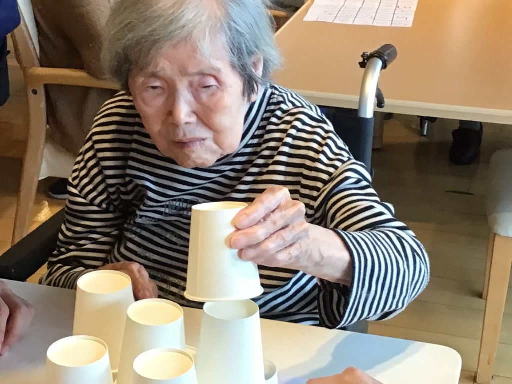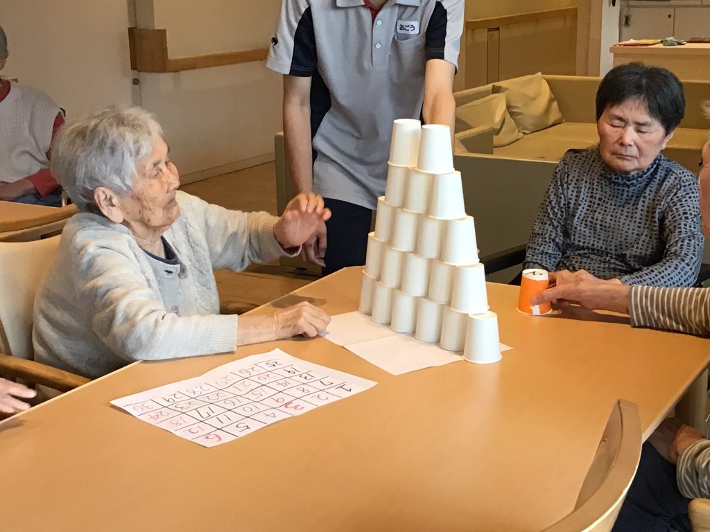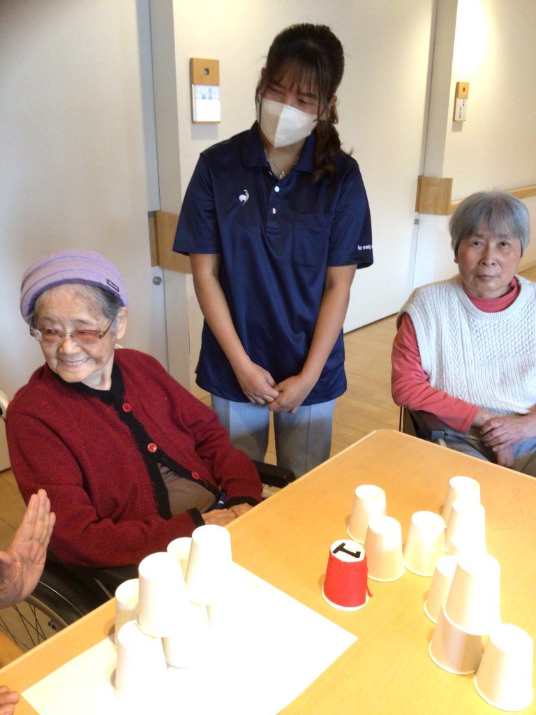 レクリエーション内容は、グループに分かれて紙コップのタワーの高さを競うものでした。