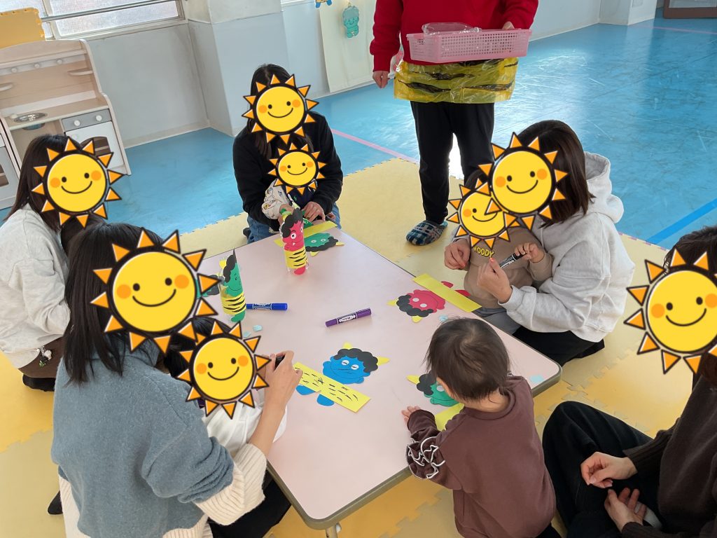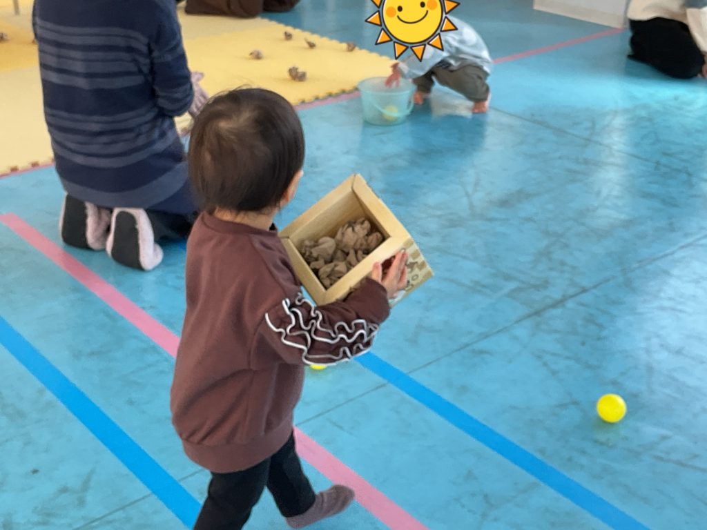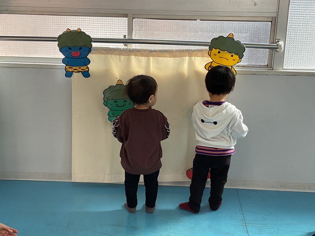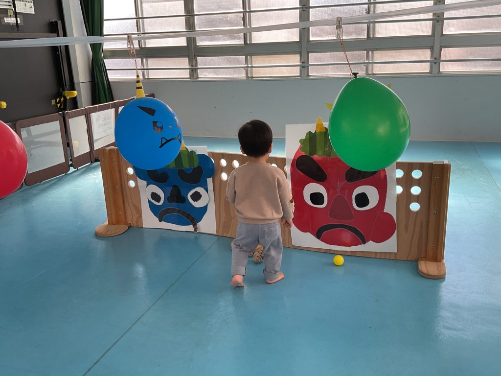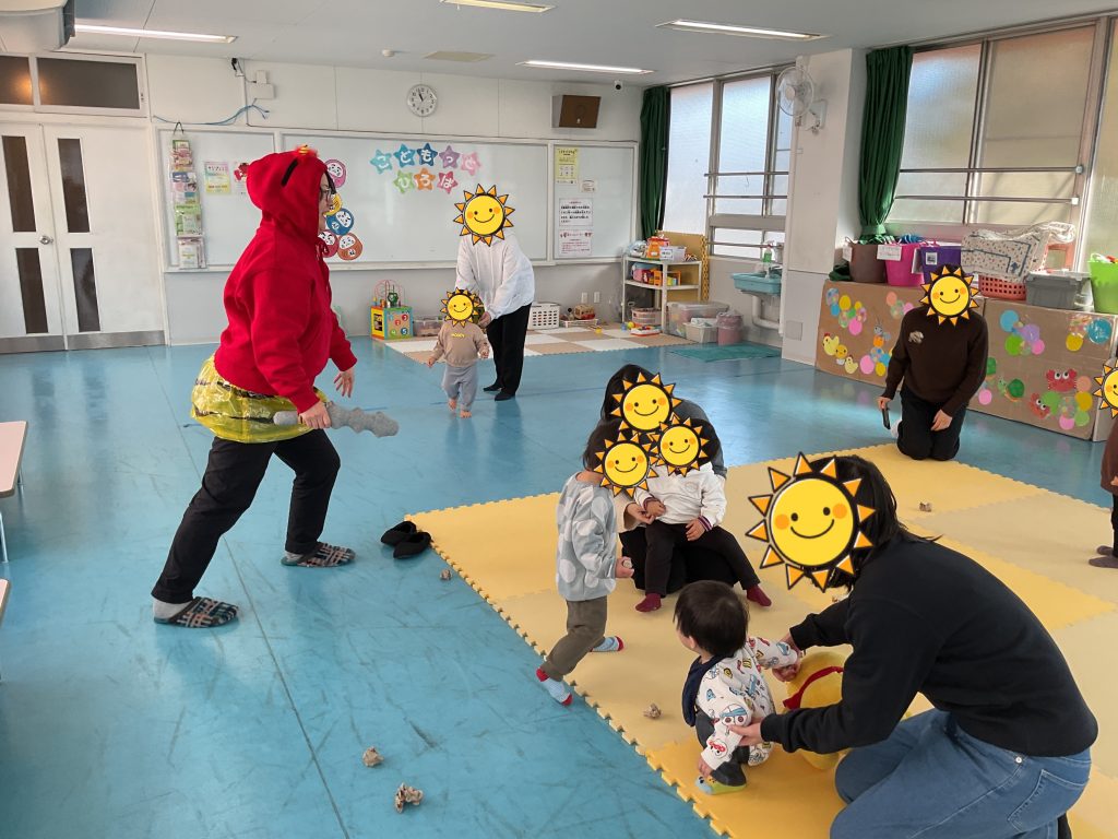 こどもっとひろばにも鬼が来て豆まきを行いました!突然の鬼の登場にびっくりしながらも、頑張って豆を投げていました(^^)/
