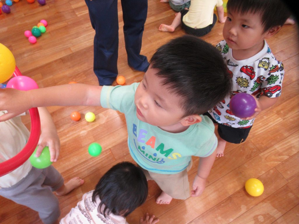 室内でもたくさん体を動かしています。今日はカラーボールでたくさん遊びました!