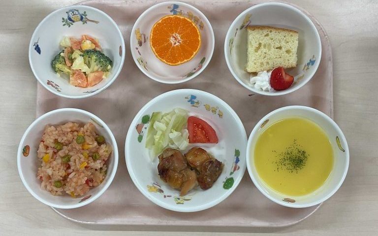 給食では、クリスマスメニューが出ました。ケチャップライス、ローストチキン、ブロッコリーとゆで卵のサラダ、コーンスープ、みかん🍊おやつにクリスマスケーキ!🎄 大きな口でぱくぱく食べてみんな完食!おいしかったね🥰
