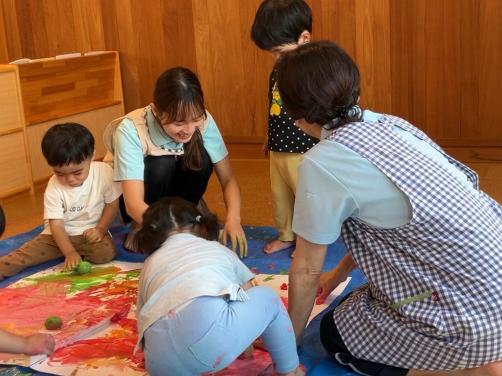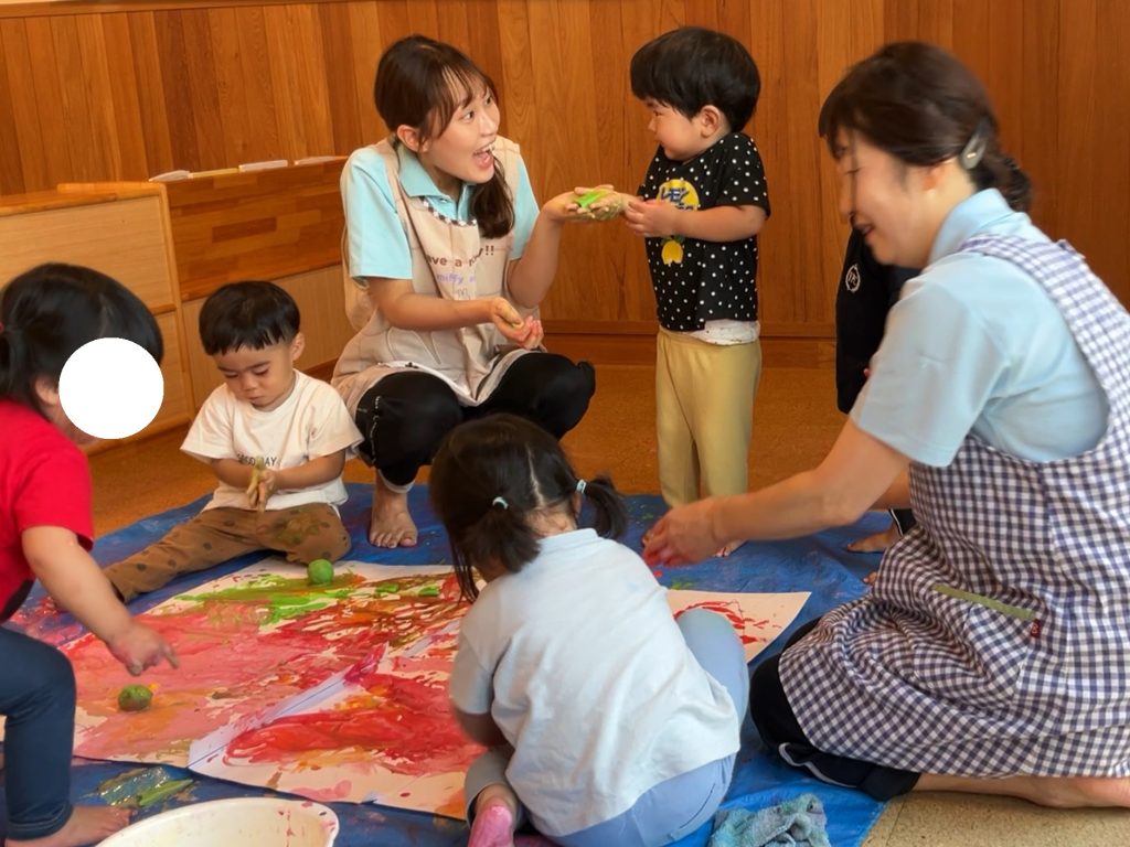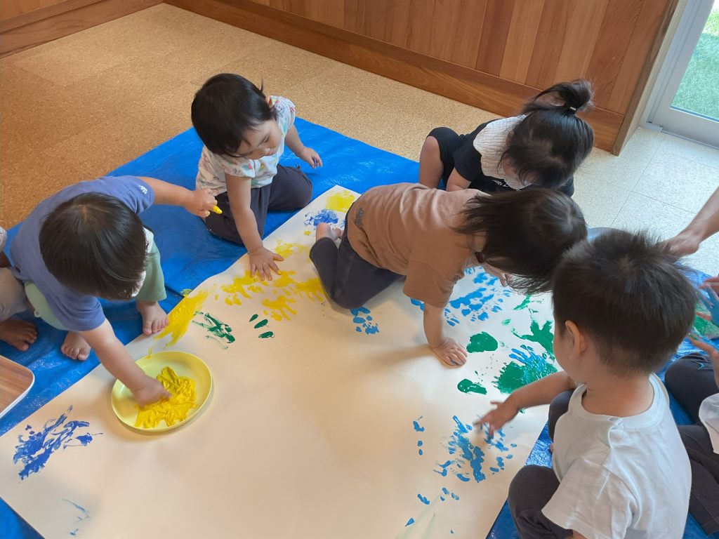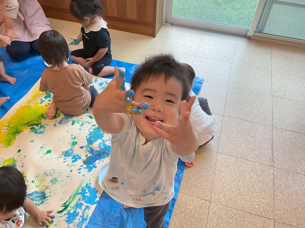 手の平や足に絵の具をたっぷり付けて大きな紙に色付けて楽しみましたよ♪