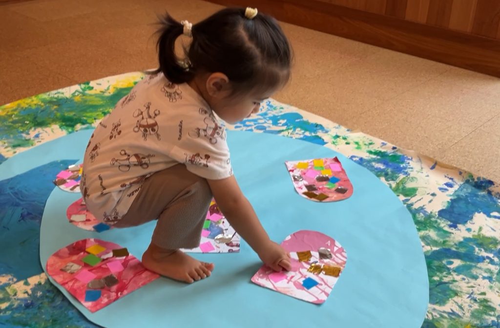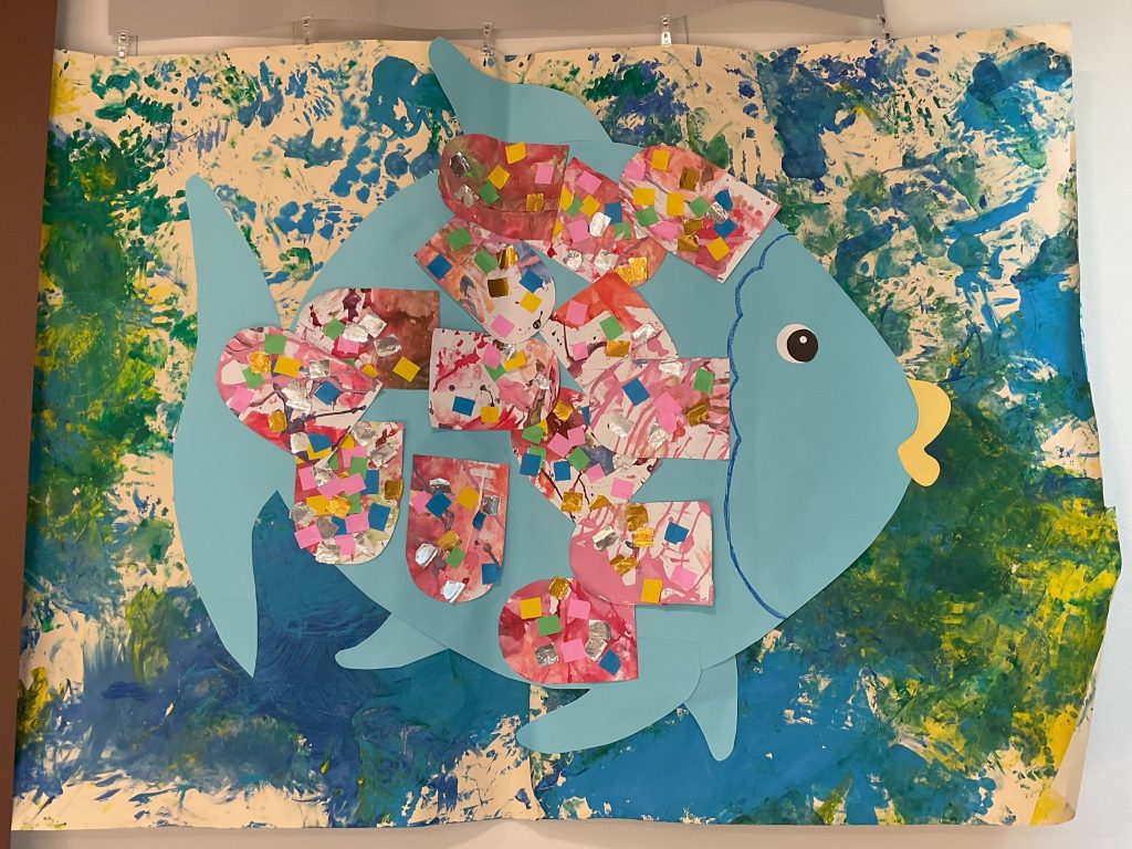 ひかり組では、絵本「にじいろのさかな」をモチーフにしてみんなで力を合わせて大きな魚を作りました⭐