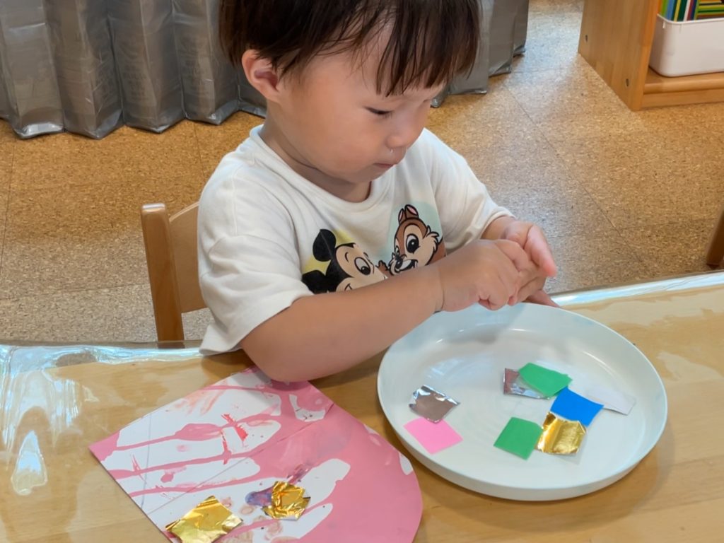 少しずつ氷の冷たさや感触に慣れて、色氷をぎゅっと握って大きな紙の上に滑らせていましたよ!✌️